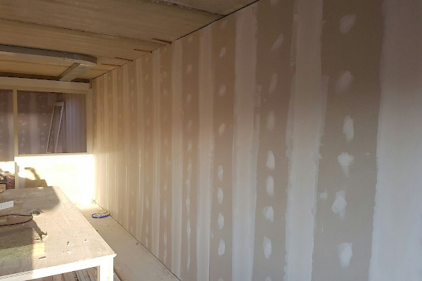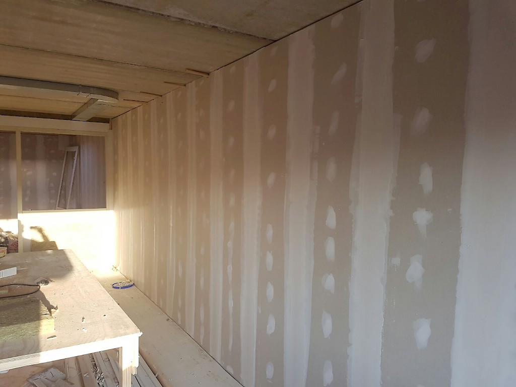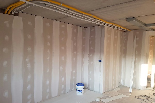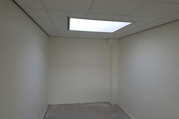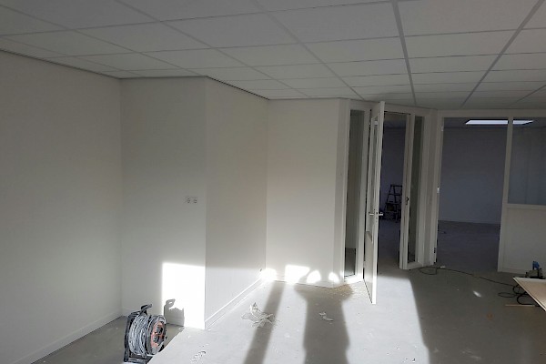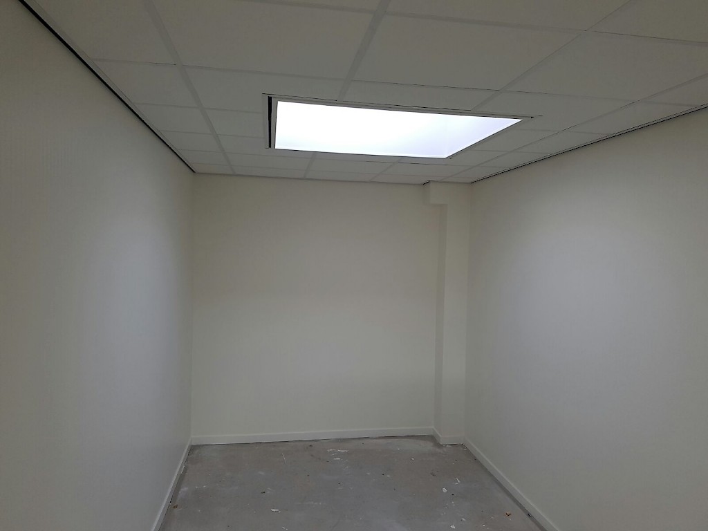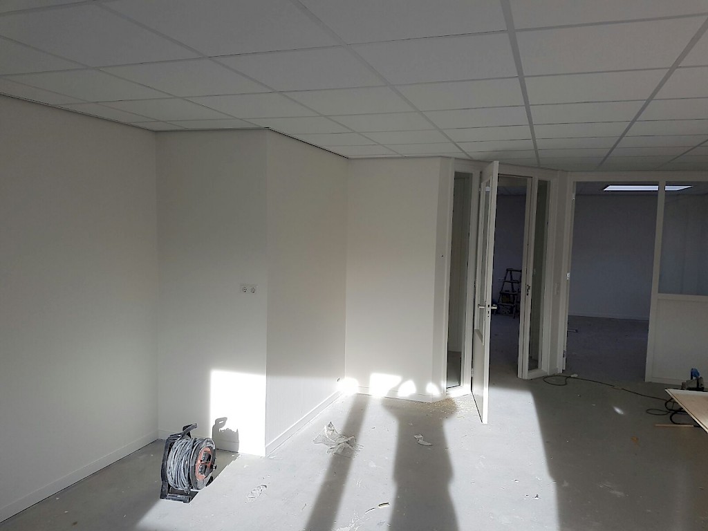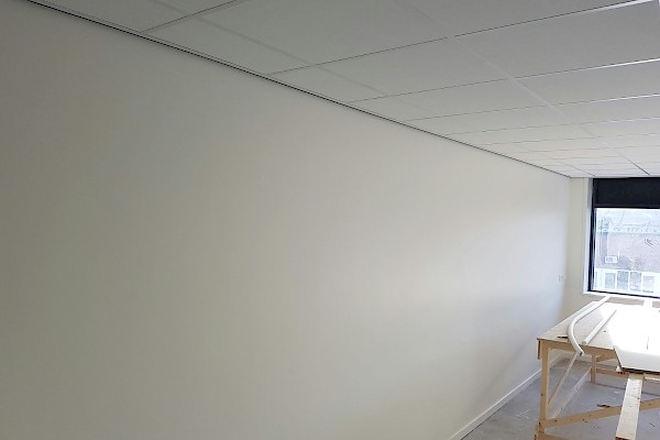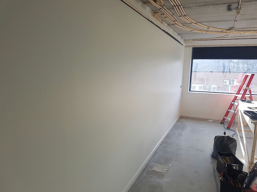 Wanden kantoor gedeelte afgewerkt met scanbehang.